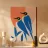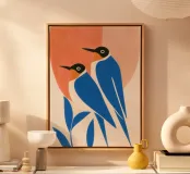 Een poëtisch duet van vorm en kleur: twee sterk gestileerde vogels rusten op blauwe bladeren voor een warme zonsondergang. De heldere geometrische lijnen en het gereduceerde kleurenpalet doen denken aan de silhouetten van Matisse en Scandinavisch grafisch design. De compositie straalt rust, nabijheid en prachtige grafische elegantie uit - een modern beeld van de natuur dat zowel decoratief als contemplatief is. Ideaal voor lichtgekleurde kamers die visuele harmonie moeten uitstralen.