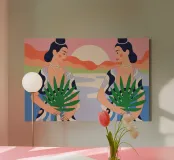 Een schilderij van twee identieke figuren die planten vasthouden tegen een achtergrond van een zonsondergang met bergen en water.