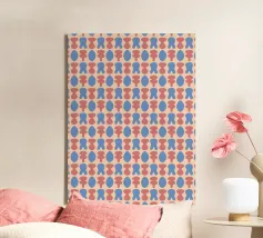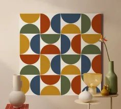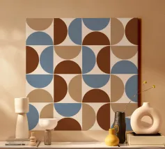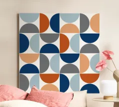 Een repeterend geometrisch patroon met afwisselend rijen van halve cirkels en cirkels in de kleuren blauw en roest tegen een lichte achtergrond. Het ontwerp creëert een gevoel van ritme en beweging door de symmetrische opstelling.