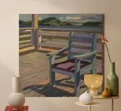 Een pastelkleurige stoel op een houten terras vangt schuin zonlicht en nodigt uit tot vredige reflectie.