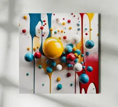 Een opvallende reeks kleurrijke verfdruppels stroomt naar beneden tegen een witte achtergrond, met levendige rode, blauwe, gele en paarse tinten. De verscheidenheid aan tinten creëert een betoverend effect.