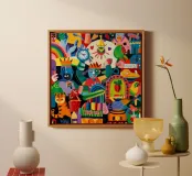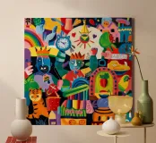 Een levendige verzameling dynamische personages en feestelijke motieven, omlijst door een explosie van kleurrijke vormen.