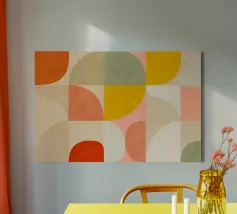 Deze abstracte compositie verkent harmonie door overlappende geometrische vormen en een warm, vintage geïnspireerd palet. Ronde rechthoeken kruisen elkaar zachtjes, waardoor gelaagde transparanties ontstaan die beweging en diepte suggereren zonder rigide structuur. Tinten van terracotta, koraal, oker, zachte crème en gedempt goud doen denken aan mid-century modern design maar blijven fris en eigentijds. De subtiele textuur van het oppervlak voegt een tactiele kwaliteit toe en brengt precisie in balans met warmte. Het kunstwerk weerspiegelt een rustig ritme en evenwicht, waardoor het een verfijnd statementstuk is voor moderne, minimalistische of retro-geïnspireerde interieurs.
