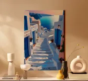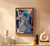 Een sereen en schilderachtig beeld van de steile, witgekalkte trappen van Santorini, versierd met levendige blauwe deuren, bloeiende bloemen en warm zonlicht. Elke trede weerspiegelt het karakter van het eiland en leidt naar de sprankelende Egeïsche Zee. Het samenspel van licht, schaduw en kleurrijke accenten creëert een meeslepende scène die de rust en charme van het meest iconische eiland van Griekenland oproept.