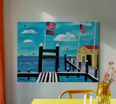 Rode en witte zeilboten rusten naast een houten steiger op stilstaand water, een beeld van zomerse sereniteit en evenwicht.