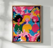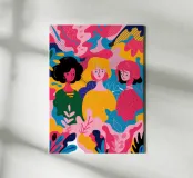 Een prachtige en krachtige illustratie toont een diverse groep vrouwen, hun gezichten en haar verweven met een levendige explosie van kleurrijke bloemen, die zusterschap, diversiteit en groei vieren.