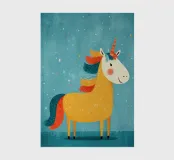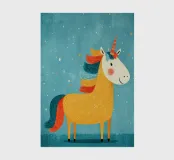Een schattige gele eenhoorn met een kleurrijke staart staat voor een blauwe achtergrond met textuur. De kinderboekillustratie maakt indruk met zijn platte ontwerp, heldere lijnen en vrolijke kleuren - een charmant, speels motief vol lichtheid.