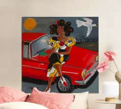 Dit kunstwerk toont een persoon die op een gestreepte stoel zit, omringd door zonnebloemen en een groene tas. De achtergrond is gedempt bruin en creëert een rustieke en reflecterende sfeer.