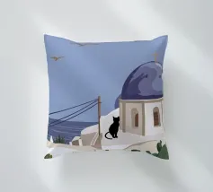 Een zwarte kat pauzeert op de iconische witgekalkte trappen van Santorini, met de beroemde rode koepelkerk en blauwe zee op de achtergrond, en legt zo een vredig moment van het Griekse eilandleven vast.