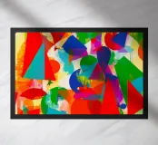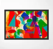Dit chaotische en energieke abstracte schilderij is een dichte compositie van elkaar overlappende geometrische vormen, voornamelijk driehoeken en cirkels. Het kleurenpalet is extreem helder en beslaat het hele spectrum: primaire kleuren zoals rood en blauw, aangevuld met helder groen, geel en magenta. De vormen lijken gedeeltelijk transparant, wat een complex diepte-effect creëert. De achtergrond is helder en rusteloos, doorkruist door verticale penseelstreken. De compositie is explosief en doet denken aan een abstracte stadsjungle.
