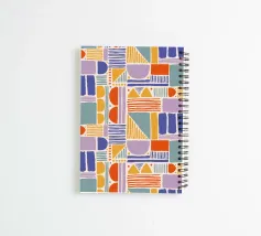 This picture shows a colourful geometric pattern that combines various abstract shapes and lines. The pattern includes semi-circles, rectangles, triangles and vertical and horizontal lines in a mixture of soft and bold colours including orange, yellow, light purple, muted blue and petrol. The repetitive arrangement of these shapes creates a playful yet balanced composition. The use of hand-drawn, uneven lines adds a sense of organic flow and artistic texture to the structured geometric pattern. The overall design