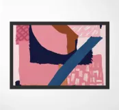 A bold and modern abstract composition features a dynamic arrangement of overlapping shapes in pink, navy blue, and black, with textured details creating a sophisticated and graphic piece.