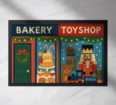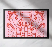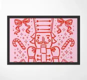 This cheerful nutcracker marches across a pink candy-coated world, surrounded by bows, sparkles, and sugar treats. A whimsical twist on a timeless classic.