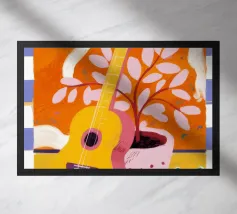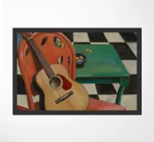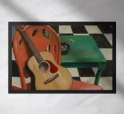 An acoustic guitar rests on a red chair beside a checkered floor, inviting stories in sound and solitude.