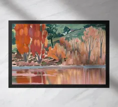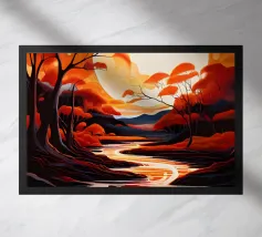 Bright orange trees twist beside a shimmering blue river. An energetic autumn day painted with joy.
