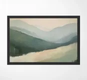 Een minimalistisch olieverfschilderij met een impasto-techniek en krachtige penseelstreken, met groene bergen tegen een lichtgele lucht. Een witte rivier stroomt door de vallei, waarbij het neutrale kleurenpalet een rustgevend effect creëert. De heuvels in de verte zijn zacht getekend en tonen een moderne kunststijl met abstracte vormen en lijnen. De algehele compositie is harmonieus en de zachte verlichting benadrukt het tafereel.