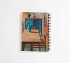 A wooden dining table stretches into a warmly lit interior filled with pottery and vibrant shadows, celebrating home�s quiet rhythm.