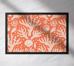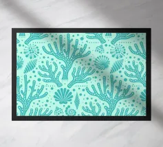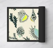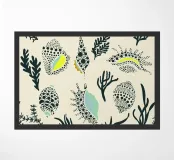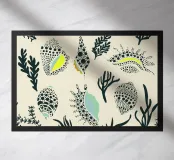 This artistic coastal design features abstract shell, coral, and sea plant shapes arranged in a balanced, modern composition. Delicate dot patterns add texture and depth, while organic silhouettes create a calm, natural rhythm. The soft color palette combines cream, muted green, deep blue, black, and subtle yellow accents for a timeless maritime aesthetic. A stylish, nature-inspired illustration with a contemporary coastal feel, ideal for lovers of minimalist, elegant art with marine motifs.