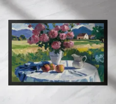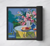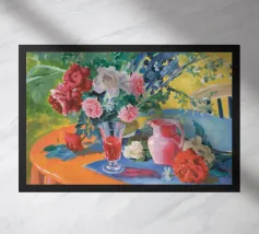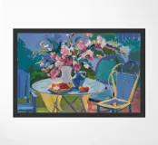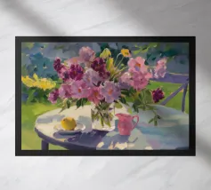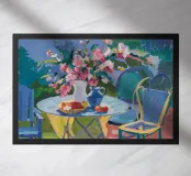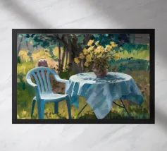 Een uitnodigend stilleven met een prachtig boeket roze en witte rozen in een vaas, elegant geplaatst op een witte tuintafel met een charmante blauwe stoel, alles in een weelderige, zonovergoten groene tuin.