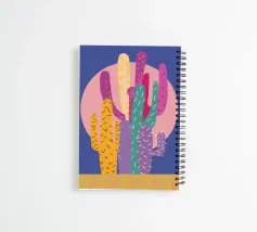 A mystical desert scene with various cacti silhouetted against a large pale sun and a purple twilight sky. The illustration has a magical, serene, and slightly surreal quality.