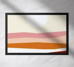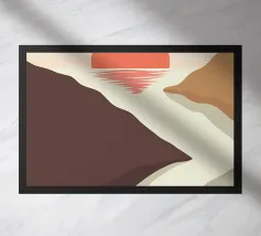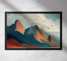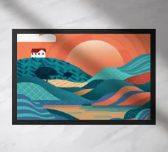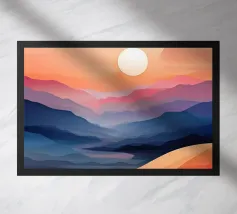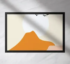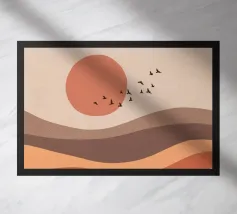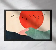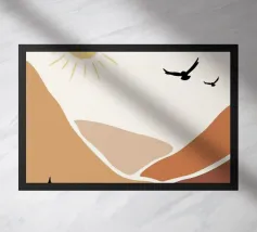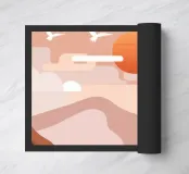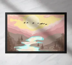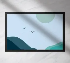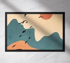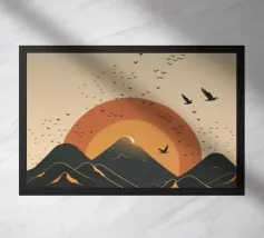 Een serene landschapsillustratie van meeuwen die over een kalme zee vliegen naar een ondergaande zon, met bergen op de achtergrond, alles in een zacht, warm kleurenpalet.