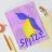 Vrolijke citroen met blauwe bladeren en blauwe letters "SPITZE" op paarse golven. Een humoristisch ontwerp met een positieve boodschap.
