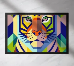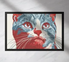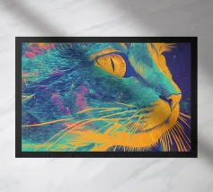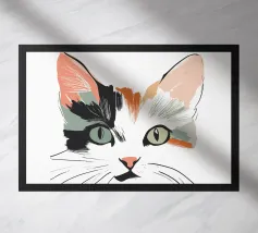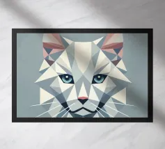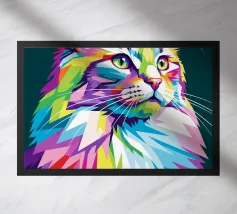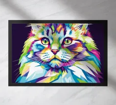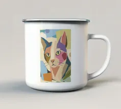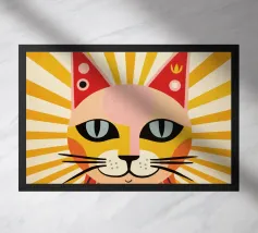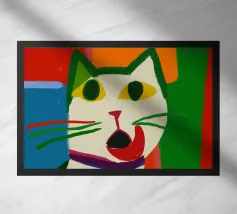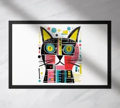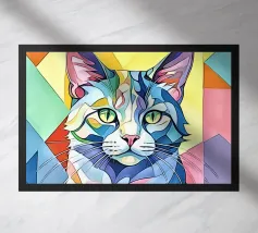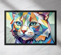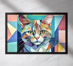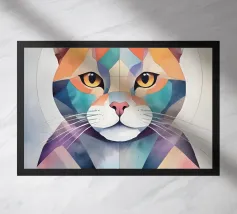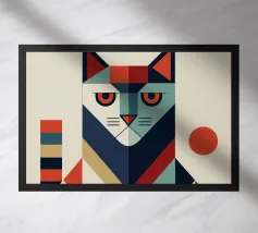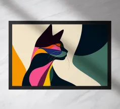 Artistieke afbeelding van een kat in abstracte stijl met kleurrijke oppervlakken - speels, modern en vol expressiviteit. Kattenmotief in geometrische kleurbloktechniek Harmonieuze, warme en levendige kleuren Eigentijdse interpretatie van een dierenklassieker Ideaal voor liefhebbers van moderne kunststijlen Expressief, creatief en veelzijdig