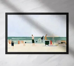 Een serene illustratie van een rustig strand, badend in warme tinten. Zonnehoeden rusten in het zand en rustieke hutten completeren het vredige tafereel, dat de essentie van langzame zomerdagen weergeeft.