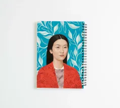 This artwork shows a person with long, dark hair wearing a red shirt. The background is filled with blue and white leafy patterns, creating a tranquil and peaceful atmosphere.
