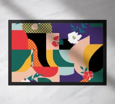 Een speelse en energieke abstracte compositie gemaakt van verschillende kleurvlakken en patronen, waaronder bloemen, rasters en strepen, als een levendige quilt.