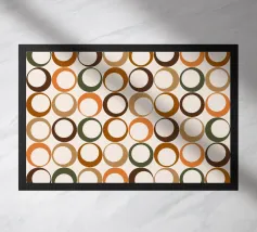 Een repeterend geometrisch patroon met afwisselend rijen van halve cirkels en cirkels in de kleuren blauw en roest tegen een lichte achtergrond. Het ontwerp creëert een gevoel van ritme en beweging door de symmetrische opstelling.
