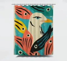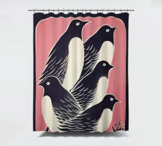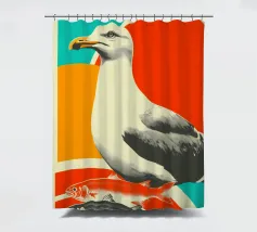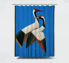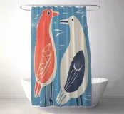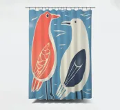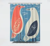 Stijlvolle illustratie van twee meeuwen in een modern volkskunstontwerp tegen een blauwe achtergrond. De elegante kleurencombinatie van koraal, roomwit en marineblauw creëert een harmonieus, maritiem contrast. De vereenvoudigde vormen en decoratieve vleugelpatronen tonen invloeden van Scandinavische en Japanse grafische tradities. De heldere lijnen geven het motief een tijdloze, vriendelijke en optimistische uitstraling. Perfect voor iedereen die partnerschap, evenwicht en natuurlijke eenvoud wil uitstralen.