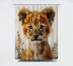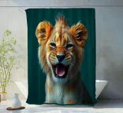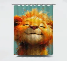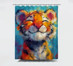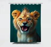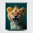 Een jong leeuwenwelpje grijnst breed en laat zijn speelse aard zien. De gouden vacht en heldere ogen van het welpje steken af tegen een donkere, kleurrijke achtergrond en creëren een levendige sfeer vol vreugde.