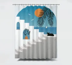 A charming illustration of a black cat sitting on the steps of a beautiful seaside town, with buildings rendered in soft pinks. The scene is peaceful, picturesque, and full of Mediterranean charm.