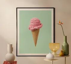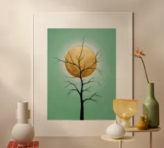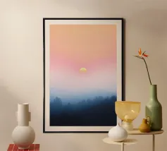 Een rustig maar levendig kunstwerk met zachte heuvels in frisse groene tinten en goudgele accenten. De scène doet denken aan een zachte dageraad boven een geïdealiseerd landschap, perfect voor minimalistische woonruimtes, moderne prints of digitale toepassingen met een natuurlijke flair.