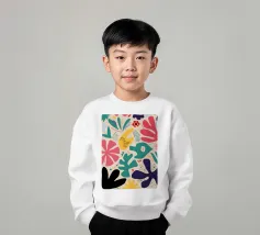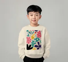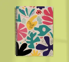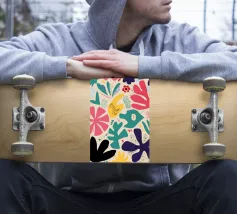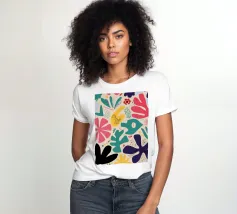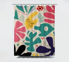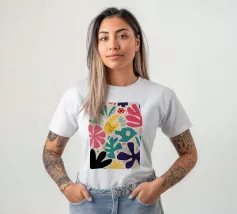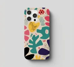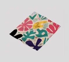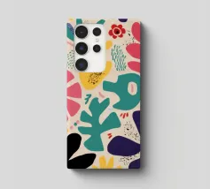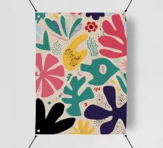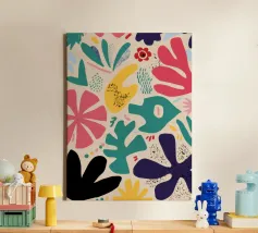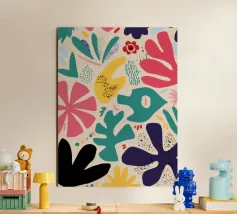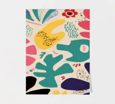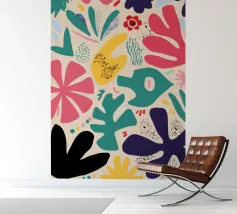 Een levendig en chaotisch arrangement van abstracte bloemen en botanische vormen in felle kleuren zoals rood, roze en blauw, waardoor een dynamisch en expressief patroon ontstaat dat doet denken aan Maraoui cut outs.