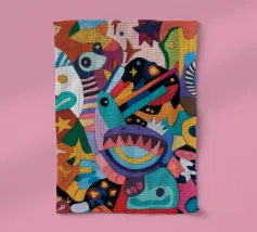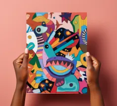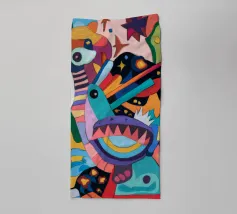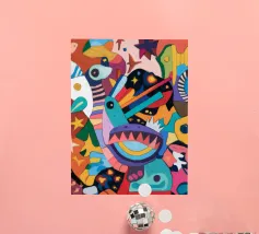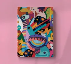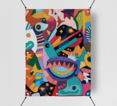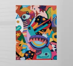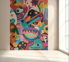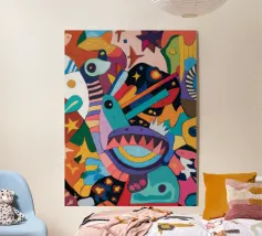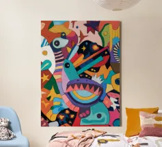In "Abstract Symphony" komt het doek tot leven met een wervelwind van kleuren en vormen, waarbij elk element danst op zijn eigen ritme in een harmonieus ballet van abstractie. Vogels, sterren en organische vormen verstrengelen zich in een levendig tapijt, hun dynamische samenspel creëert een gevoel van voortdurende beweging en grenzeloze energie. Gedurfde rood-, blauw-, geel- en groentinten doorspekken het tafereel, trekken de aandacht en prikkelen de verbeelding.