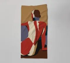 Een abstracte, minimalistische voorstelling van een liggende menselijke figuur, met gebruik van krachtige kleurvlakken�rood, wit en aardetinten�om de schoonheid van de menselijke vorm te verkennen door middel van vorm en houding.