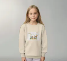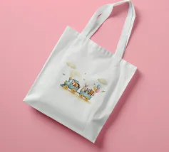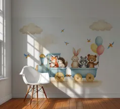 Stap in een wereld vol wonderen met deze hartverwarmende illustratie van een pastelblauwe trein bestuurd door een vos en een egel, die een konijn, een wasbeer en een beer met kleurrijke ballonnen vervoert. Omringd door pluizige wolken en tsjilpende vogels is deze grillige print met zachte textuur perfect voor kinderkamers, speelruimtes en kinderkamers. Het straalt warmte, verbeelding en vriendschap uit.