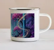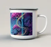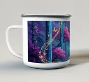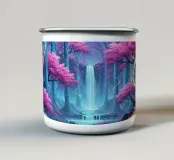 Betoverende waterval in het maanlicht. Een surrealistisch landschap met trapsgewijze watervallen onder een grote, heldere maan. Kersenbloesembomen met levendig roze gebladerte versterken de scène.