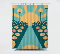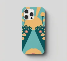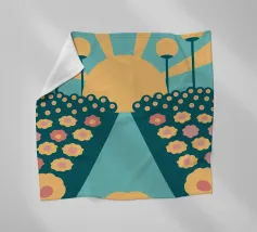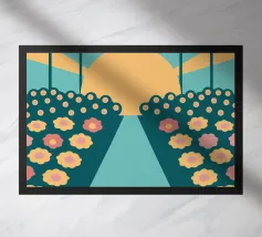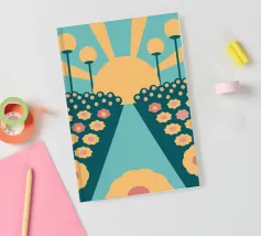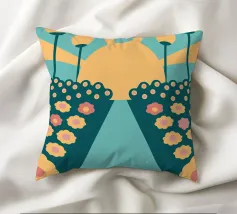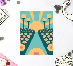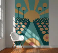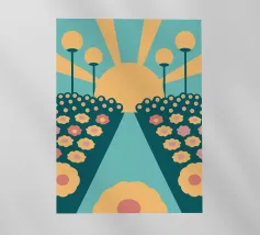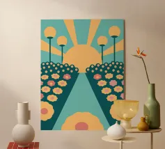 Een bloementuinontwerp in retrostijl met een combinatie van unieke kleuren en eenvoudige vormen, waardoor een interessante en opvallende look ontstaat.