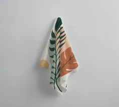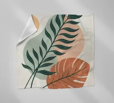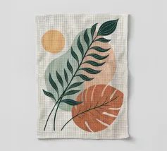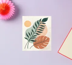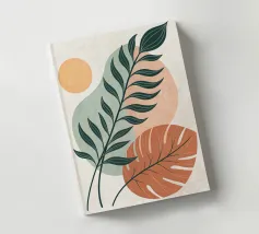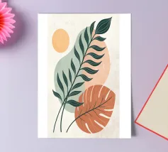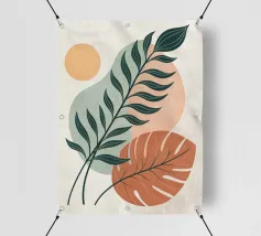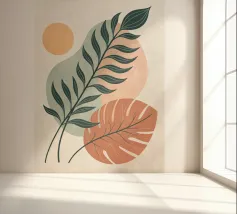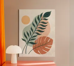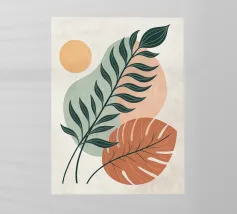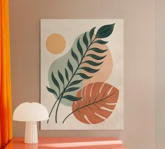 Deze moderne boho abstracte muurkunst vangt de serene schoonheid van de natuur met een chique, minimalistische twist. Met twee overlappende tropische bladeren - één in diep, weelderig groen en de ander in warm, aards terracotta - tegen een gestructureerde, gebroken witte achtergrond. De compositie wordt in evenwicht gehouden door zachte, abstracte vormen in gedempte tinten saliegroen en perzikbeige, samen met een eenvoudige terracotta cirkel, die een gevoel van rust en kalmte oproept. Dit stuk is perfect om een vleugje botanische elegantie en bohemienachtige flair toe te voegen aan een woonkamer, slaapkamer, kantoor of galeriemuur. De warme, uitnodigende kleur