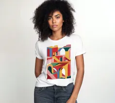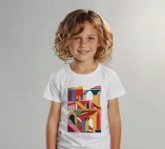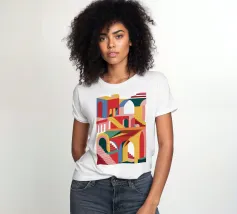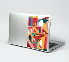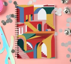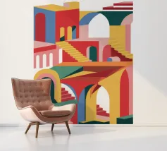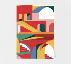 Een complexe architecturale illustratie met lagen kleurrijke trappen, bogen en gebouwen in rood, geel en blauw. De compositie creëert een levendig en speels labyrint, vol energie en geometrische interesse.