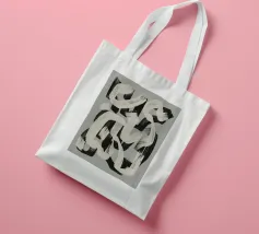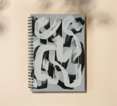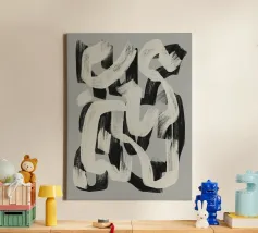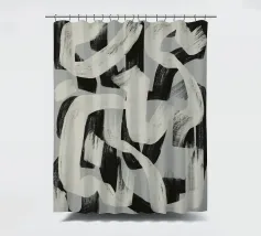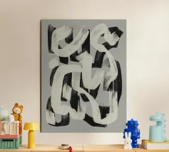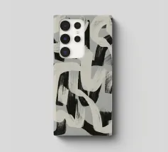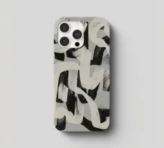 Abstracte zwarte en witte penseelstreken lopen in elkaar over op een grijze achtergrond, waardoor een dynamisch patroon ontstaat. De krachtige penseelstreken suggereren beweging en energie, terwijl het grijstintenpalet het contrast benadrukt.