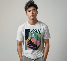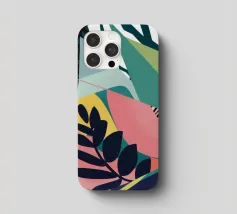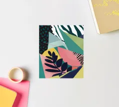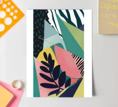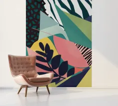 Een abstract kunstwerk deconstrueert een jungle scène in gefragmenteerde vormen van bladeren en licht, met een gedurfd zwart-wit patroon dat een grafisch, modern randje toevoegt aan het botanische thema.