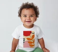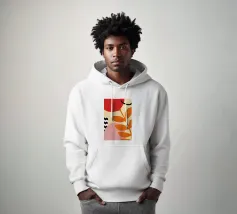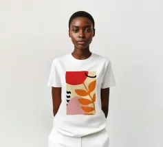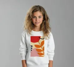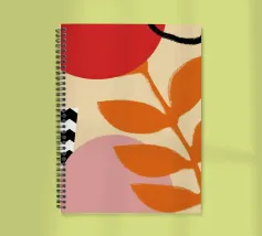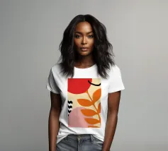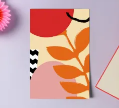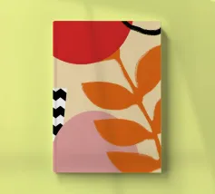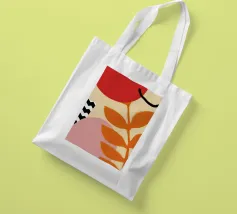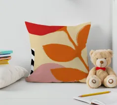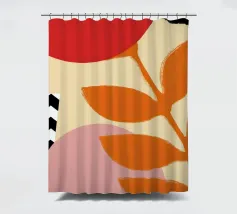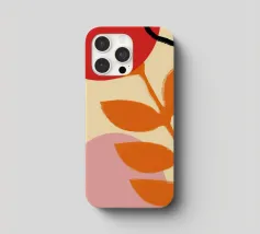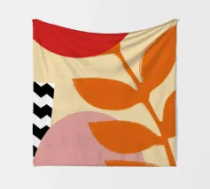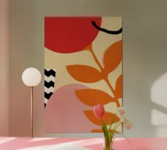 Een gedurfde en grafische botanische compositie met een grote, gestileerde tak van oranjerode bladeren tegen een achtergrond van abstracte vormen, creëert een krachtig en modern statement.