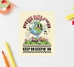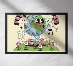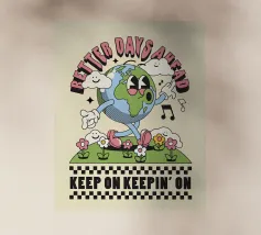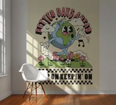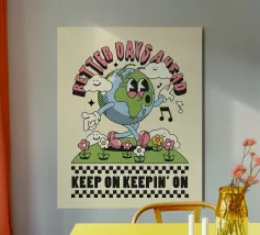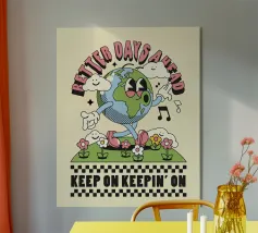 Geef je ruimte een dosis vintage optimisme met deze charmante "Gimme Better Days Ahead" kunstdruk. Een vrolijk, lachend aardmannetje staat in het middelpunt, met uitgestrekte handen, geflankeerd door grillige wolken en bloeiende bloemen, allemaal onder een stralende zon. De speelse, retro-stijl belettering in pastelroze draagt bij aan de algehele vrolijke en hoopvolle esthetiek, die doet denken aan klassieke tekenfilms en jaren '70 vibes. Deze hoogwaardige digitale kunst wordt gepresenteerd in een verbluffende resolutie van 7000 x 5000 pixels bij 300 dpi, wat zorgt voor haarscherpe details en levendige kleuren voor een eersteklas poster.