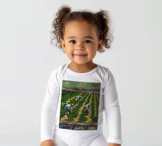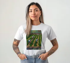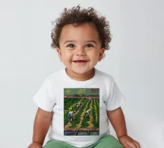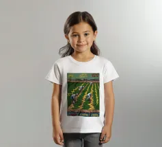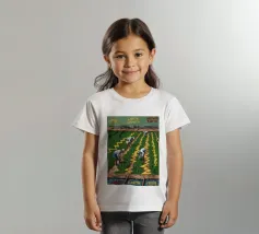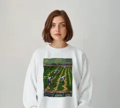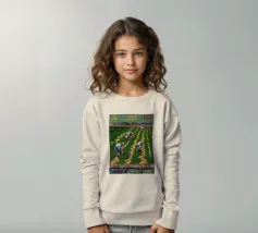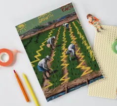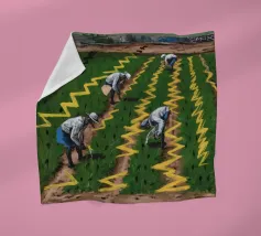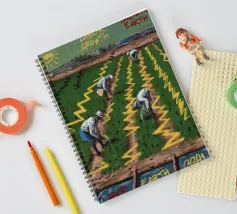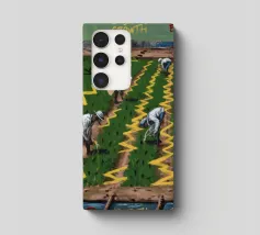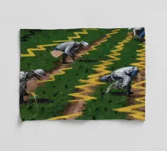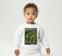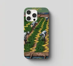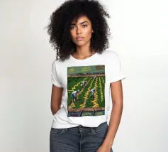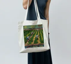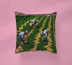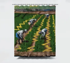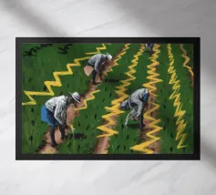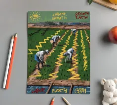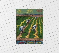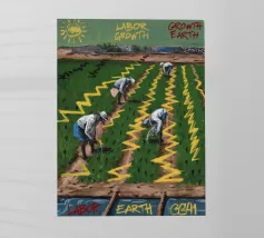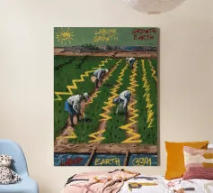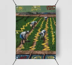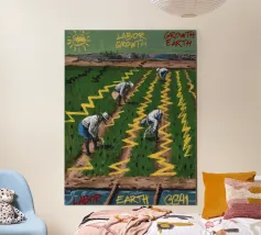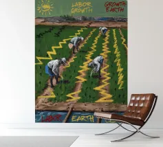 Boeren zwoegen onder een gouden hemel, hun inspanningen staan genoteerd in de woorden 'LABOR' en 'GROWTH'. Aards groen en geel geven het schilderij grond in ijver en vernieuwing.