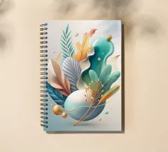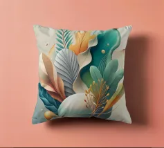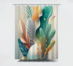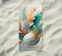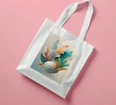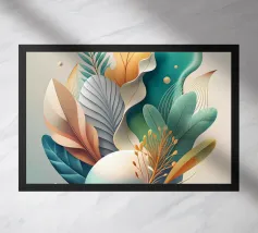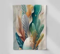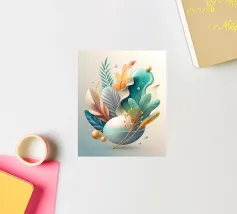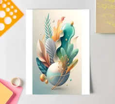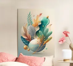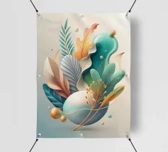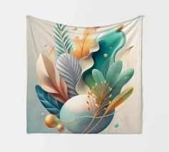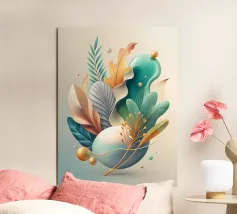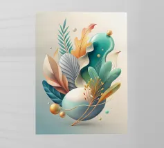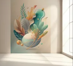 Een levendige en abstracte compositie met kleurrijke bladeren, delicate bloemen en gladde, organische vormen in een harmonieuze mix van herfsttinten.