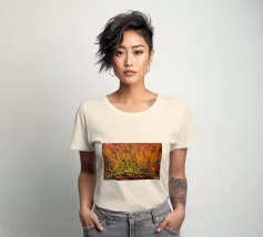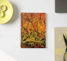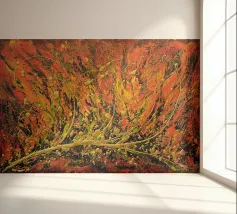 Een semi-abstract schilderij in herfstkleuren. Een gouden tak in reliëf met kleine vruchten tegen een achtergrond van okerkleurig, oranje en rood gebladerte.